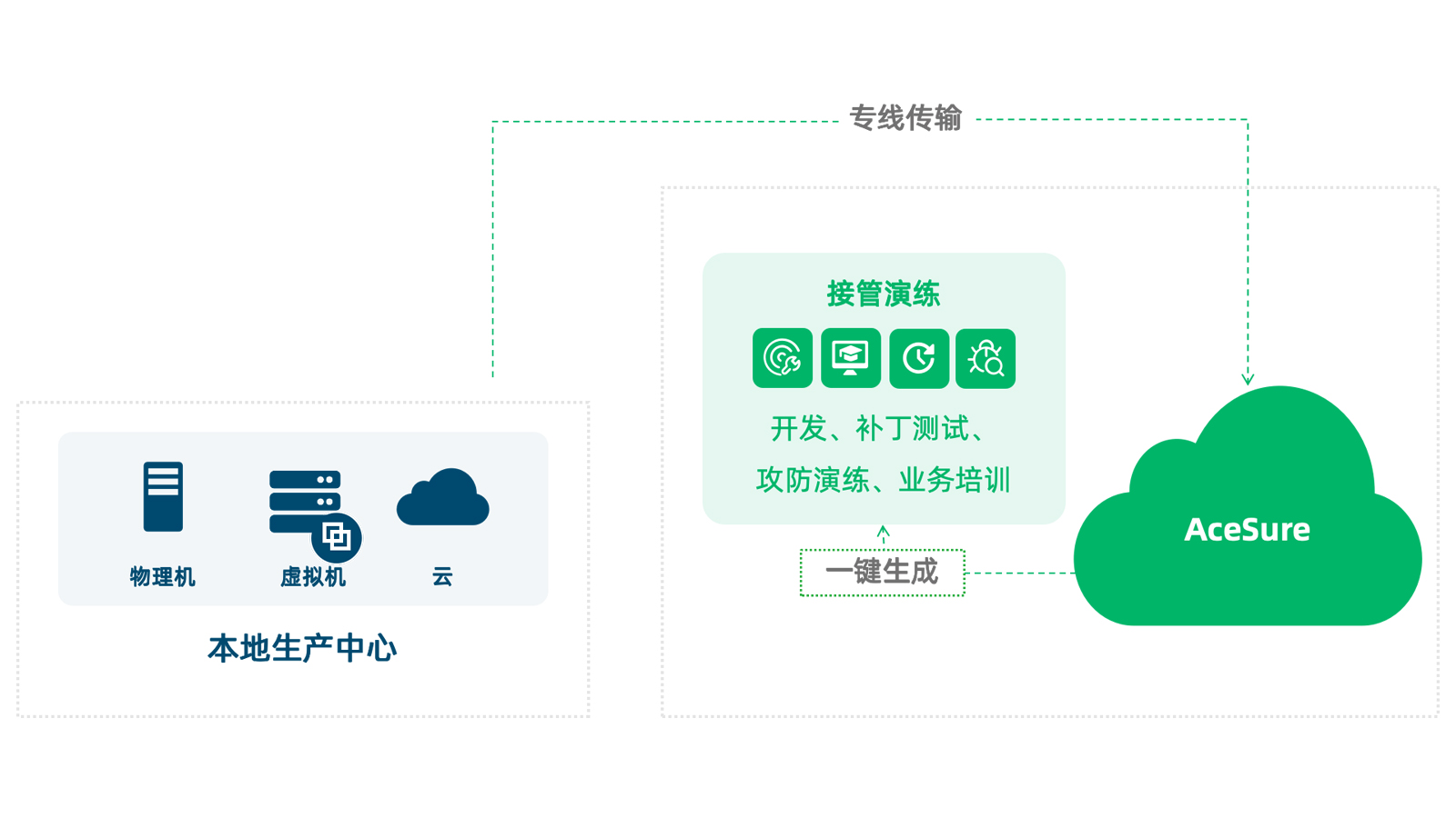 实操演练能够帮助操作人员巩固灾备体系的操作流程和步骤,避免出现疏漏。AceSure能够一键模拟生产业务(应用/数据/网络),快速生成沙盘模拟环境,在不影响生产环境的情况下,提供应用升级、补丁升级、配置升级及软件兼容性测试等工作,避免灾备环境在业务切换中遇到数据不一致问题而引发生产事故。